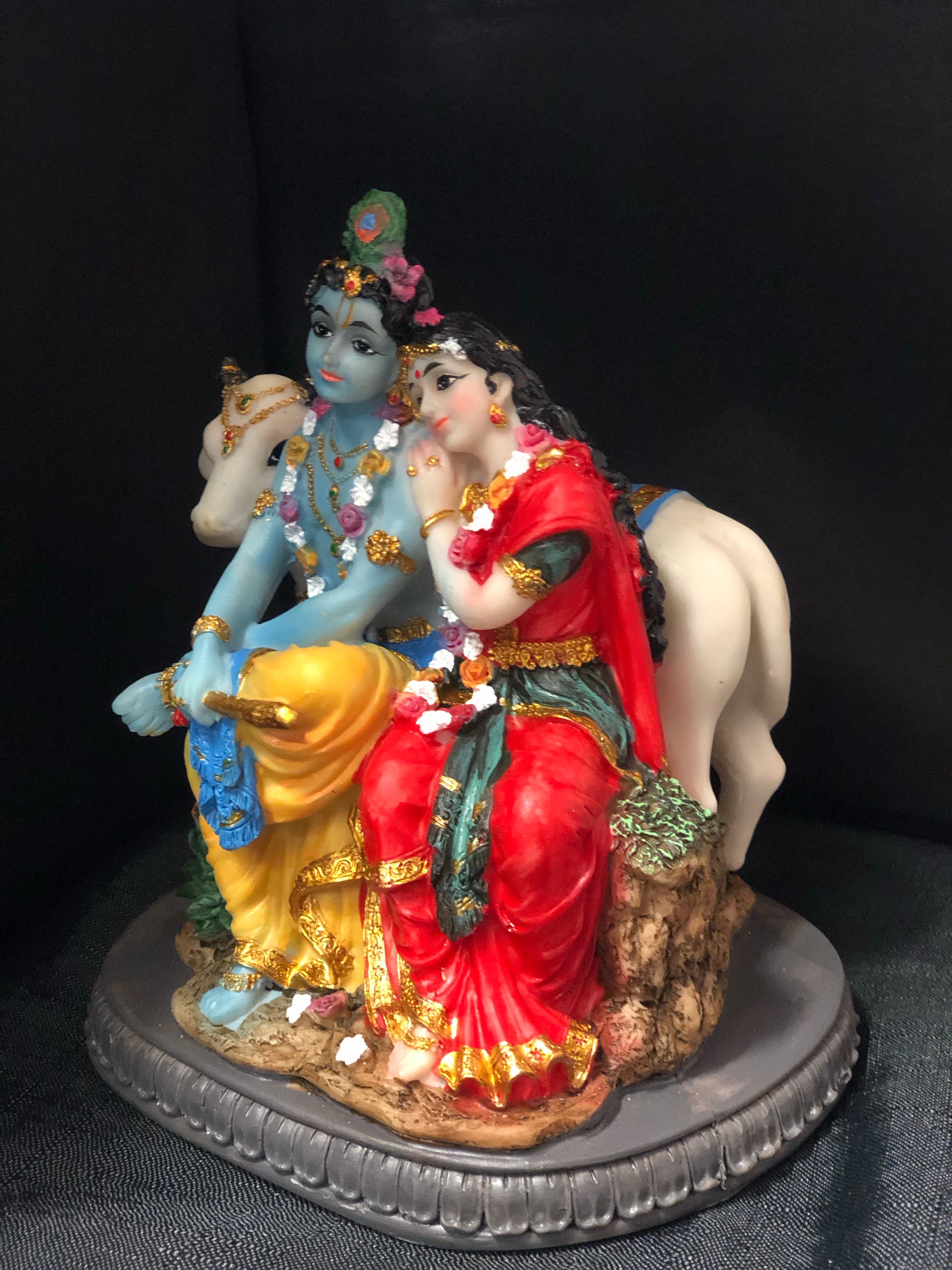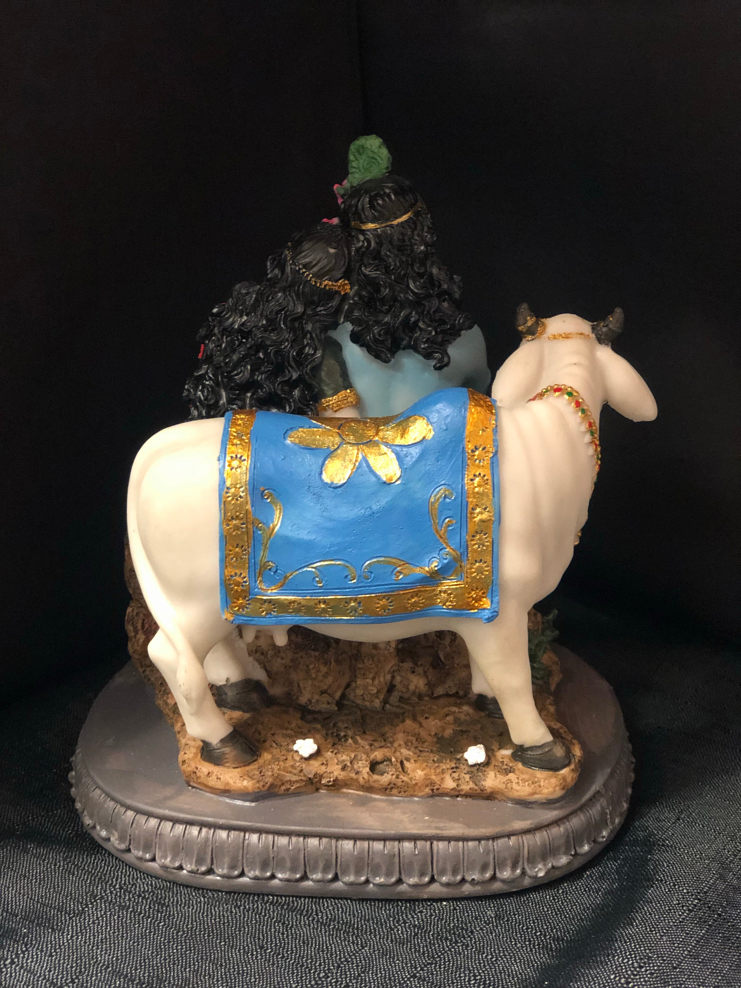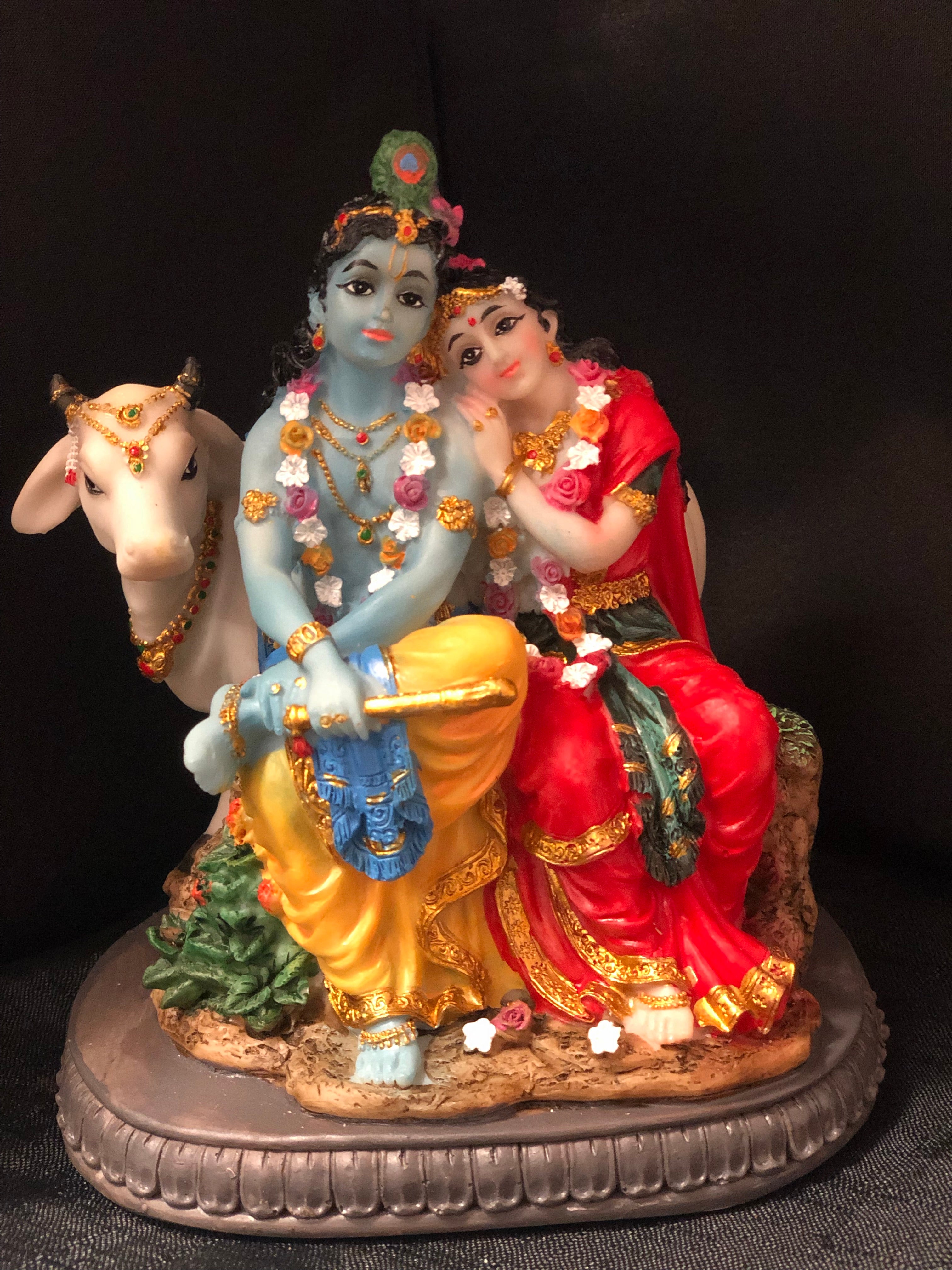 A beautiful hand painted poly-resin figure of The Divine Couple seated accompanied by a cow.